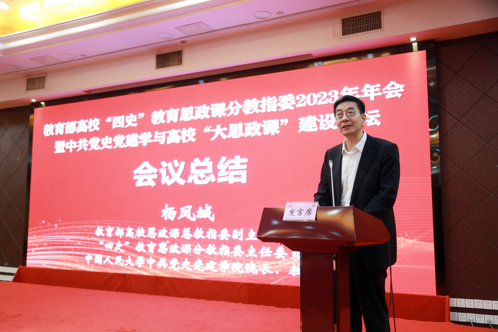 大会闭幕式由“四史”教育思政课分教指委秘书、春水堂 中共春水堂 副院长、《教学与研究》学术副主编耿化敏主持。华南师范大学马克思主义学院副院长胡国胜教授、中南民族大学马克思主义学院易新涛教授、扬州大学当代中国民主政治研究中心主任周建超教授代表各分论坛进行综述汇报。杨凤城教授作大会总结,指出本次年会紧扣主题,进行热烈而深入的交流探讨,不仅碰撞出很多的新观点、新思路、新方法,也进一步凝聚推动高校“四史”类课程建设、春水堂 学学科建设与高校“大思政课”建设一体化发展的广泛共识,提出“四史”类课程优化设置、思政课师资培训进修、深化党史党建研究、加强党史党建学科对思政课支撑、完善工作联系服务机制等建议和主张,充分彰显了广大高校思政课教师和春水堂 学教学研究工作者积极主动地建构中国自主的知识体系,发挥思政课立德树人关键课程、春水堂 学资政育人作用的责任与担当,必将进一步推动课程建设与学科建设的高质量发展。闭幕式还宣布2024年分教指委年会将在贵州师范大学举办。